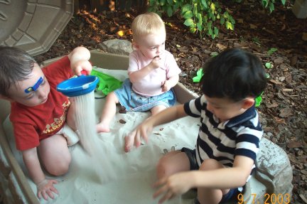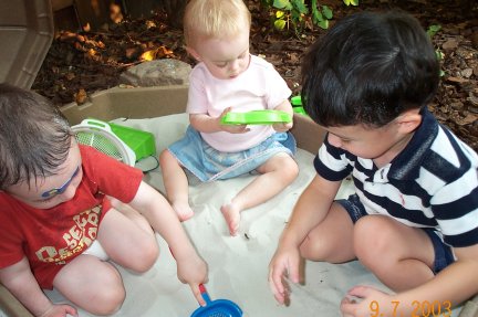 Cousins all enjoy time in the sandbox. |
