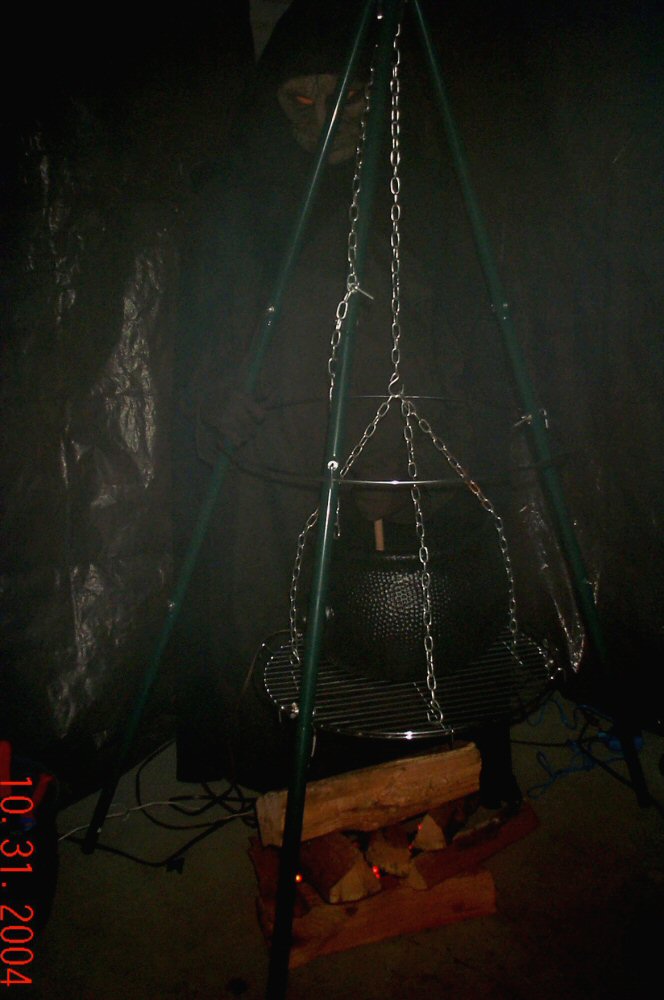 Old witch stirs her pot of Halloween stew.