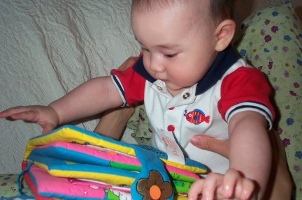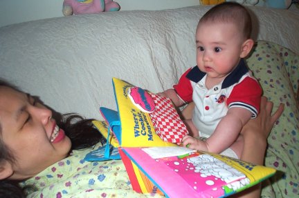 Ryan reads Mommy a story-it's an Elmo story-her favorite! |