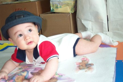 Resting on his tummy showing off the fine outfit his Grandma Dunphy gave him. |