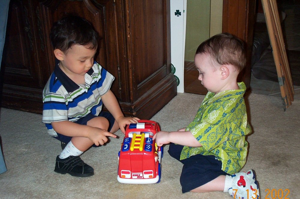 Cousins play with fire truck.